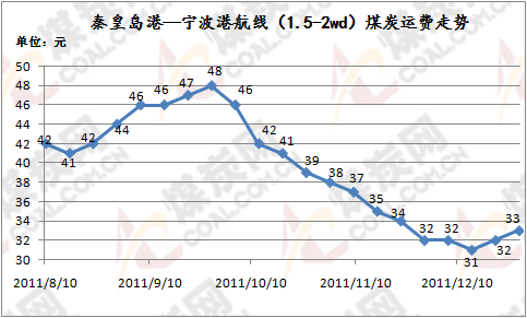 沿海煤炭運輸運價方面:煤炭網(wǎng)信息研究中心近期數(shù)據(jù)顯示,秦皇島港到寧波港沿海煤炭運費在歷經(jīng)連續(xù)11周的下跌,截至12月7日最低降至31元/噸之后,近兩周略現(xiàn)回升態(tài)勢,截至12月21日,秦皇島港到寧波港煤炭沿海運費回升2元/噸至33元/噸。雖然國內(nèi)主要航線的煤炭運輸需求長期持弱,但臨近年關(guān),又面對如此不景氣的航運市場,船東陸續(xù)封船,造成現(xiàn)今出海船舶數(shù)量大量減少,航運市場供需平衡狀況有所改善,受之影響,煤炭沿海運費自然出現(xiàn)小幅回升。當(dāng)然,近期秦皇島港至寧波港航線煤炭運費的小幅上漲短時間內(nèi)對到寧波港煤炭價格產(chǎn)生的影響微乎其微。