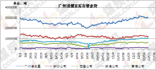 煤炭網(wǎng)信息研究中心截至12月22日的數(shù)據(jù)顯示,本周廣州港動(dòng)力煤價(jià)格再現(xiàn)20-60元/噸的下跌,5500大卡山西優(yōu)混到港價(jià)格整體走低20元/噸,4900大卡神混3號(hào)也出現(xiàn)大幅度的下跌。