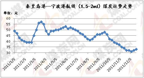 與此同時(shí),在沿海煤炭運(yùn)輸方面,秦皇島港-寧波港航線煤炭海運(yùn)費(fèi)2011年走勢也體現(xiàn)了不同階段下游煤炭需求、采購力度等狀況。