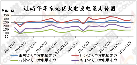 下游煤耗方面,2011年的“水電不給力”對國內(nèi)尤其是西南地區(qū)的動力煤市場帶來的緊張影響是有目共睹的,可見,在下游耗煤行業(yè)當(dāng)中,電力耗煤企業(yè)對煤炭市場的影響可以說是舉足輕重的,貫穿了整個(gè)2011年的“煤電之爭”也說明了電力、煤炭行業(yè)之間緊密的市場聯(lián)系。相關(guān)數(shù)據(jù)顯示,2011年1-11月,全國發(fā)電量的產(chǎn)量達(dá)41939億千瓦小時(shí),同比增長12.02%,其中華東地區(qū)的江蘇省發(fā)電量的產(chǎn)量達(dá)3425.7億千瓦小時(shí),同比增長11.18%,占全國總產(chǎn)量的8.17%,排在第一位,山東總發(fā)電量占全國6.89%,排第三位。上述狀況均說明了華東地區(qū)的電力需求量大,相對應(yīng)的對電煤也是維持了相當(dāng)大的需求。2011年底我國的火電總裝機(jī)將突破7.5億KW,加上近期國家上調(diào)了電價(jià),預(yù)計(jì)2012年華東地區(qū)電煤消耗只能在2011年的基礎(chǔ)上有一定幅度的增長而不會走低,對動力煤市場也將維持穩(wěn)定的支撐。