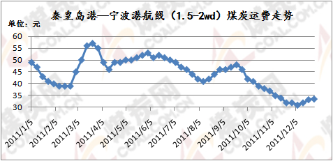 沿海煤炭運輸運價方面:煤炭網(wǎng)信息研究中心近期數(shù)據(jù)顯示,秦皇島港到寧波港沿海煤炭運費本周繼續(xù)微幅上漲,煤炭網(wǎng)信息研究中心截至12月28日的數(shù)據(jù)顯示,該航線煤炭運價較上周略漲0.3元/噸至33.6元/噸,主要與沿海航運市場封船增多,供需關(guān)系發(fā)生變化所致。