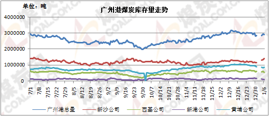 港口庫存方面,煤炭網(wǎng)信息研究中心數(shù)據(jù)顯示,本周廣州港煤炭庫存量仍在高位,近期雖略有走貨,但總體走貨跡象不夠明顯,下游運煤仍不積極,尤其是臨近春節(jié),電煤消耗面臨進一步的走低,煤炭網(wǎng)信息研究中心數(shù)據(jù)顯示,截至1月6日,廣州港煤炭庫存量為293.7萬噸,較2011年12月31日增加8.6萬噸。