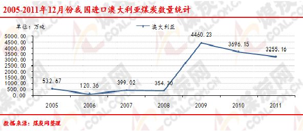2005-2011年12月份我國進(jìn)口澳大利亞煤炭數(shù)量走勢統(tǒng)計(jì)