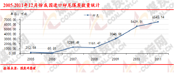 2005-2011年12月份我國進口印尼煤炭數(shù)量走勢統(tǒng)計