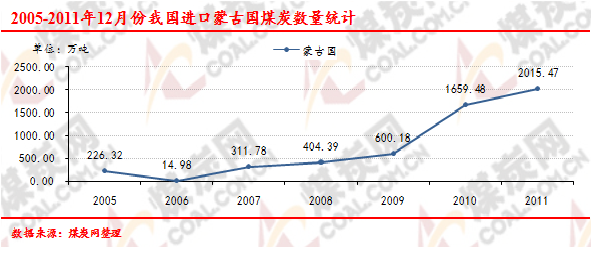 2005-2011年12月份我國進(jìn)口蒙古國煤炭數(shù)量走勢(shì)統(tǒng)計(jì)