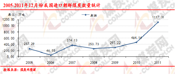 2005-2011年12月份我國進(jìn)口朝鮮煤炭數(shù)量走勢統(tǒng)計(jì)