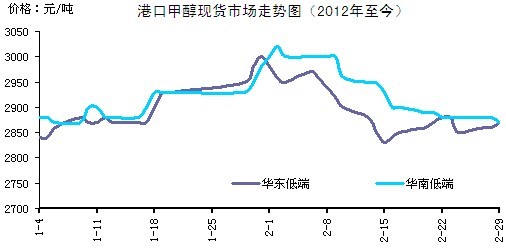 2011年以來,港口甲醇市場呈現(xiàn)倒“V”字型走勢,價(jià)格于2月初達(dá)至高點(diǎn),此后開始回落。截止2月底,華東地區(qū)收于2870-2980元/噸,價(jià)格較1月初小幅回升1.5%;華南2870-28元/噸,較1月初基本持平。