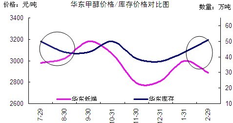 從圖中可以看出,自元旦之后,港口地區(qū)庫存開始上升,且在春節(jié)之后增幅有所擴(kuò)大。截止2月底,該地庫存已達(dá)50萬噸以上。進(jìn)入2月份的第二周,港口逼倉現(xiàn)象嚴(yán)重,一部分甲醇產(chǎn)品自身庫存上升,另一部分主要源自于化工產(chǎn)品之間的“爭罐”現(xiàn)象。2月15日,華東地區(qū)價(jià)格達(dá)到年后低點(diǎn),江蘇成交頻臨2800元/噸。