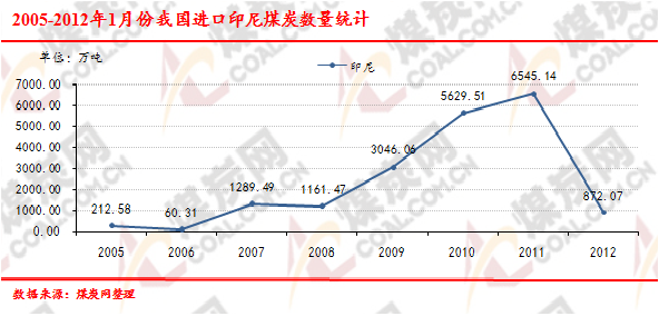 2005-2012年1月份我國進(jìn)口印尼煤炭數(shù)量走勢統(tǒng)計