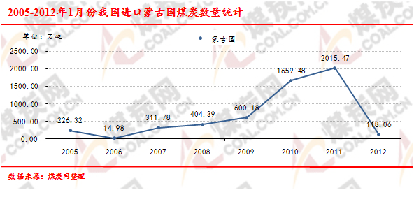 2005-2012年1月份我國(guó)進(jìn)口蒙古國(guó)煤炭數(shù)量走勢(shì)統(tǒng)計(jì)