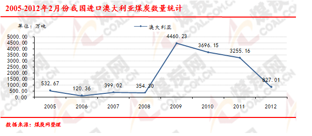 2005-2012年2月份我國(guó)進(jìn)口澳大利亞煤炭數(shù)量走勢(shì)統(tǒng)計(jì)