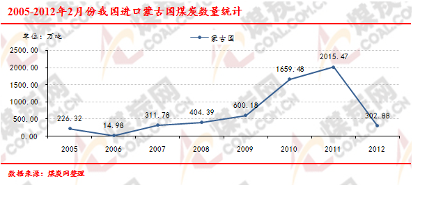 2005-2012年2月份我國進(jìn)口蒙古國煤炭數(shù)量走勢統(tǒng)計(jì)