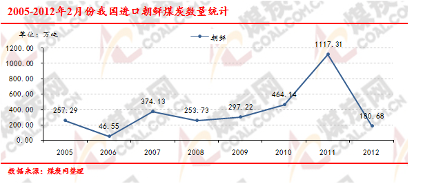 2005-2012年2月份我國進口朝鮮煤炭數(shù)量走勢統(tǒng)計