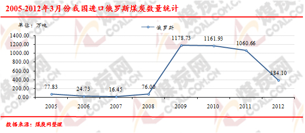 2005-2012年3月份我國進口俄羅斯煤炭數量走勢統(tǒng)計