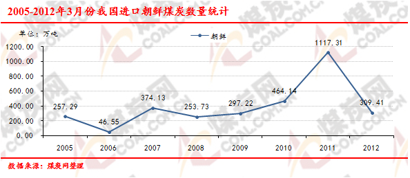 2005-2012年3月份我國進口朝鮮煤炭數(shù)量走勢統(tǒng)計
