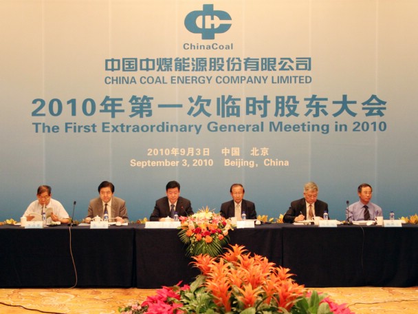 9月3日,中煤能源股份公司在京召開了2010年第一次臨時股東大會,會議審議通過了《關于變更公司A股募集資金投資項目的議案》。王安同志主持會議,并回答了股東代表提出的有關公司A股募投變更項目、全年產量計劃、煤機裝備業(yè)務、整合山西地方煤礦等方面的問題。