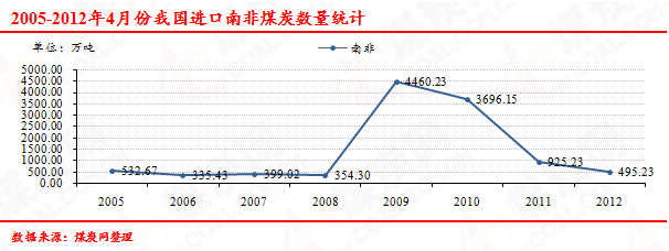 2005-2012年4月份我國進口南非煤炭數(shù)量走勢統(tǒng)計