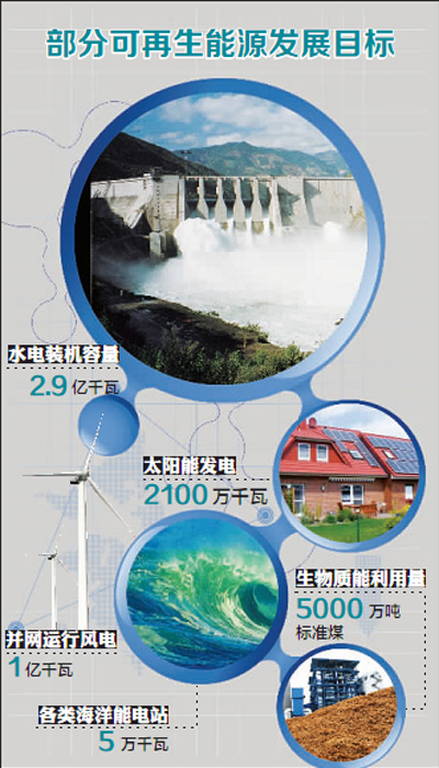 “十二五”時期我國可再生能源發(fā)展的總體目標是:到2015年,可再生能源年利用量達到4.78億噸標準煤,其中商品化年利用量達到4億噸標準煤,在能源消費中的比重達到9.5%以上。