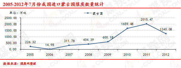 2005-2012年7月份我國進口蒙古煤炭數(shù)量走勢統(tǒng)計