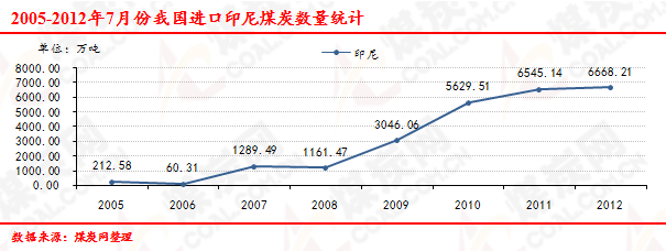2005-2012年7月份我國進口印尼煤炭數(shù)量走勢統(tǒng)計