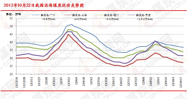 沿海運費:截止到10月22日,現(xiàn)秦皇島港-廣州港(5-6萬DWT)運費36.8元/噸,周環(huán)比保持不變;秦皇島-福州(3-4萬DWT)運費33.8元/噸,周環(huán)比下跌0.2元。天津-上海(2-3萬DWT)運價30.4元/噸,周環(huán)比回落0.1元;天津-鎮(zhèn)江(1-1.5萬DWT)運價36.7元/噸,周環(huán)比回落0.1元;秦皇島-寧波(1.5-2萬DWT)運價31.5元/噸,周環(huán)比保持不變。近期下游電廠日耗持續(xù)偏低,電廠存煤可用天數(shù)接近25天高位水平,以及大秦線檢修形成對煤炭沿海運輸形成利空。在下游需求不足,以及盈利承壓的影響下,海上煤炭運輸供需矛盾日益突出,船舶公司長時間虧損所造成的經(jīng)營壓力,以及成本構(gòu)成因素將對海運費形成支撐,致使其不會在深度下滑,但是后期仍將維持低迷運作態(tài)勢。