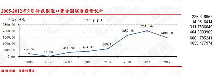 2005-2012年9月份我國進(jìn)口蒙古煤炭數(shù)量走勢統(tǒng)計(jì)