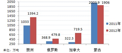 2012年我國進口澳洲煉焦煤總量為1394.2萬噸,較2011年增長361.2萬噸,同比增幅35%;進口俄羅斯焦煤總量為479.8萬噸,較2011年增長110.9萬噸,同比增幅30%;進口加拿大焦煤總量為719.5萬噸,較2011年增長397.2萬噸,同比增幅123.2%。而進口蒙古焦煤總量為1906萬噸,較2011年略微下降了97.9萬噸,同比降幅為4.9%。隨著全球鋼鐵需求逐漸達到峰值,加之歐美發(fā)達國家的新能源革命席卷,可以預(yù)見到未來將有更多國家將煤炭出口指向亞洲市場,而中國在通過質(zhì)價競爭對比后,進口渠道選擇也將更為多元化。因此對于蒙古國而言,守住自己的出口市場必將要面對來自其它傳統(tǒng)與新興煤炭出口國帶來的更多競爭與挑戰(zhàn)。