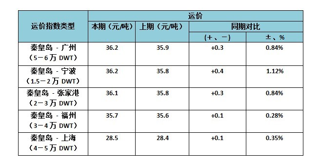 此表包含中國沿海(散貨)運價指數-煤炭(秦皇島港航線)運價指數的本期和上期數,以及同比增減。