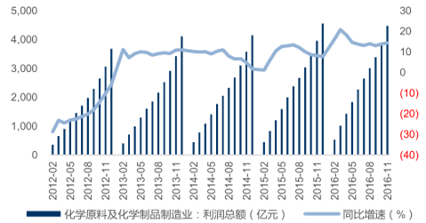 化工品漲價(jià)提升化工企業(yè)盈利能力。2016 年化工產(chǎn)品終端需求改善疊加較低的庫存狀況,化工產(chǎn)品價(jià)格普遍出現(xiàn)上漲,其中基礎(chǔ)化工類產(chǎn)品、聚氨酯類產(chǎn)品價(jià)格上漲約 35%,氯堿價(jià)格上漲 30%,橡膠、化纖類產(chǎn)品價(jià)格上漲 25%,價(jià)格上漲的直接帶動化學(xué)品制造業(yè)企業(yè)收入底部反轉(zhuǎn),行業(yè)利潤總額快速提升,截止 2016 年 11 月底,化學(xué)原料及化學(xué)制品制造業(yè)收入增速已由 2015 年底的 2.3%回升至 5.3%,利潤增速由 7.7%提升至 14.4%。