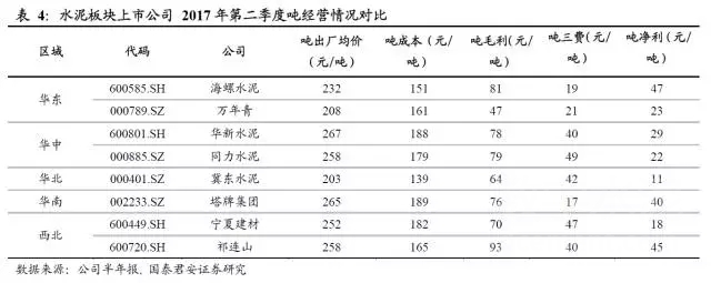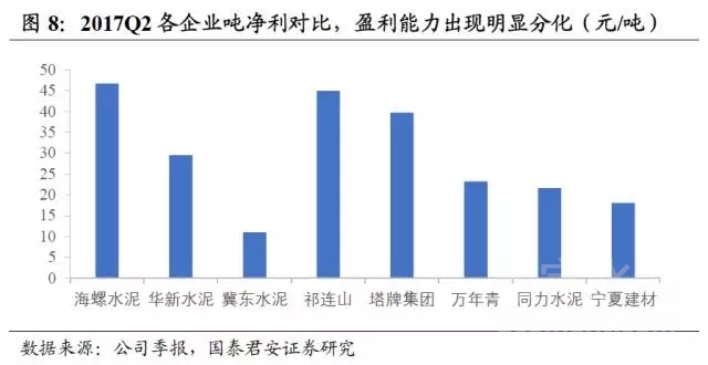 噸凈利看,龍頭海螺水泥Q2為47元/噸,西北的祁連山為45元/噸(主要是成本煤炭較低,噸毛利高導(dǎo)致),華南的塔牌集團(tuán)為40元/噸,而華北的冀東水泥,西北的寧夏建材噸凈利為11元/噸、18元/噸。
