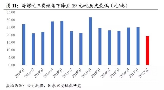 以海螺水泥為例,在今年整體行業(yè)供給側(cè)改革蔓延的情況下,產(chǎn)能利用率依然保持93%以上,繼續(xù)深化管理降低負(fù)債率,Q2噸期間費(fèi)用下降至19元/噸的歷史最低位。
