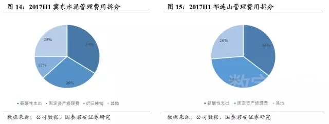 對比受錯(cuò)峰停產(chǎn)政策影響的華北、西北企業(yè)看,冀東水泥、同力水泥、祁連山、寧夏建材噸三費(fèi)均在40元/噸以上。以冀東為例,上半年銷量同比下滑19%,導(dǎo)致管理費(fèi)用中固定資產(chǎn)折舊及停產(chǎn)停窯修理費(fèi)占比超過40%;祁連山修理費(fèi)占比也接近40%,而對比海螺、塔牌兩家企業(yè),修理折舊占比分別為13%、23%。