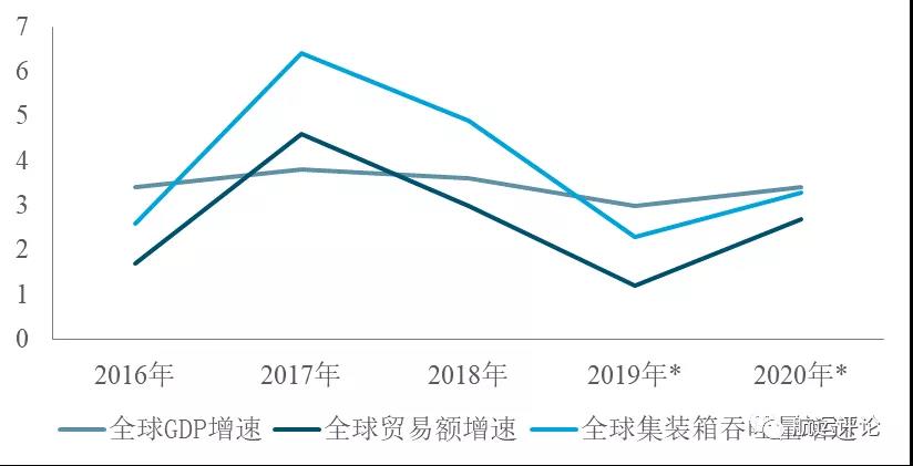 注:*表由IMF、WTO、Drewry官網(wǎng)預(yù)測(cè)數(shù)據(jù)來源:IMF、WTO、Drewry官網(wǎng)圖1 2016年-2019年全球GDP增速、全球貿(mào)易額增速、全球集裝箱吞吐量增速