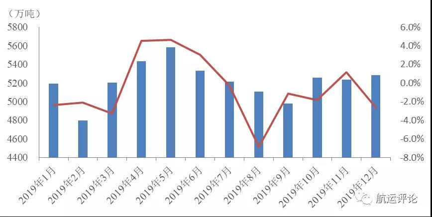 圖5 2019年韓國(guó)港口貨物吞吐量及增速