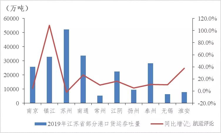 2019年中國(guó)內(nèi)河港口貨物吞吐量表現(xiàn)強(qiáng)勁,全國(guó)港口完成貨物吞吐量47.6億噸,同比增長(zhǎng)19.4%,與去年增速相比大幅增長(zhǎng)。自2019年一季度起,中國(guó)內(nèi)河港口吞吐量就保持15%以上的強(qiáng)勁增速,主要由于長(zhǎng)江內(nèi)河對(duì)“黑碼頭”的整治,貨源集中至長(zhǎng)江沿線大港,促進(jìn)港口吞吐量大幅上漲。江蘇省是全國(guó)內(nèi)河港口大省,內(nèi)河港口貨物吞吐量約占全國(guó)的53%,隨著江蘇省港口資源整合的進(jìn)一步推進(jìn),以南京港、蘇州港為首的江蘇省港口群不斷強(qiáng)化營(yíng)銷網(wǎng)絡(luò)、優(yōu)化航線布局,進(jìn)一步釋放一體化改革紅利,2019年江蘇省港口內(nèi)河貨物吞吐量得以大幅增長(zhǎng),完成貨物吞吐量25億噸,同比增長(zhǎng)18%。其中,鎮(zhèn)江港港口貨物吞吐量增速與去年相比翻番,主要由于今年基建、房地產(chǎn)投資增速漲勢(shì)良好,鎮(zhèn)江港礦物性建筑材料實(shí)現(xiàn)大幅增長(zhǎng),提振港口貨物吞吐量上漲。