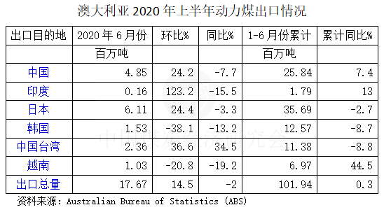 據(jù)澳大利亞統(tǒng)計局Australian Bureau of Statistics (ABS)發(fā)布的數(shù)據(jù)顯示, 2020年上半年,澳大利亞動力煤出口1.02億噸,同比增長0.3%。其中,6月份動力煤出口1767萬噸,同比下降2.2%;環(huán)比增長14.5%。