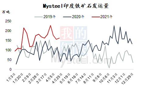 從Mysteel統(tǒng)計(jì)的印度的發(fā)運(yùn)數(shù)據(jù)來(lái)看,近期印度的發(fā)運(yùn)仍然維持在較高水平。