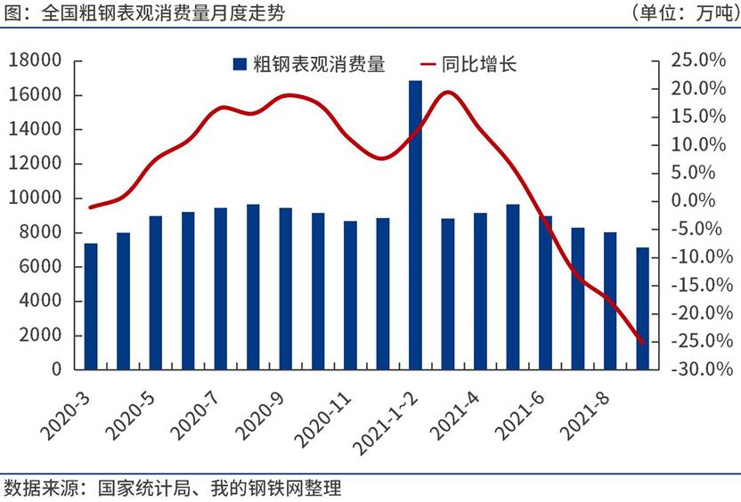 統(tǒng)計(jì)局、海關(guān)總署數(shù)據(jù)顯示,2021年9月份,全國(guó)粗鋼產(chǎn)量7375萬(wàn)噸,鋼材凈出口366.4萬(wàn)噸,折合粗鋼凈出口381.7萬(wàn)噸(鋼材按0.96折算),鋼坯、鋼錠凈進(jìn)口146萬(wàn)噸,粗鋼表觀消費(fèi)量7139.3萬(wàn)噸,同比下降25.2%。(注:2020年9月份,全國(guó)粗鋼產(chǎn)量修正為9359.1萬(wàn)噸,粗鋼表觀消費(fèi)量修正為9540.5萬(wàn)噸。)