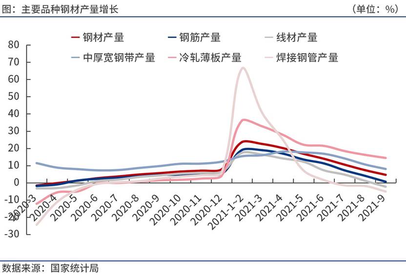 按鋼材品種來(lái)看,2021年1-9月份,我國(guó)鋼材產(chǎn)量10.2億噸,同比增長(zhǎng)4.6%。其中,鋼筋產(chǎn)量1.95億噸,同比增長(zhǎng)0.6%;線材產(chǎn)量1.21億噸,同比下降2.3%;冷軋薄板產(chǎn)量3245.1萬(wàn)噸,同比增長(zhǎng)14.4%;中厚寬鋼帶產(chǎn)量1.38億噸,同比增長(zhǎng)8.0%;焊接鋼管產(chǎn)量4366.1萬(wàn)噸,同比下降5.1%。