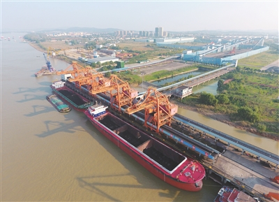 10月24日,在江西省九江市濂溪區(qū)的江西省煤炭儲備中心的長江碼頭,工人正在將貨船上的電煤通過傳輸帶裝到鐵路專用線的貨物列車上。
