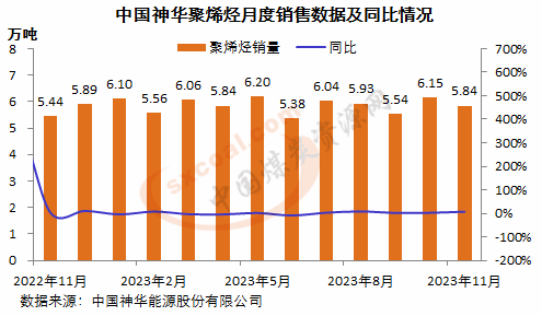 2023年1-11月,中國神華累計銷售聚烯烴64.64萬噸,同比增長1%。其中,銷售聚乙烯33.16萬噸,同比增長1.8%;銷售聚丙烯31.48萬噸,同比微增0.1%。
