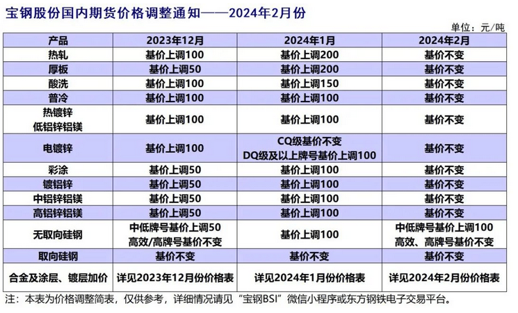 經(jīng)研究決定,寶鋼股份板材內(nèi)銷價(jià)格2024年2月份在2024年1月份基礎(chǔ)上調(diào)整公告如下(以下除特殊注明外,均為不含稅):