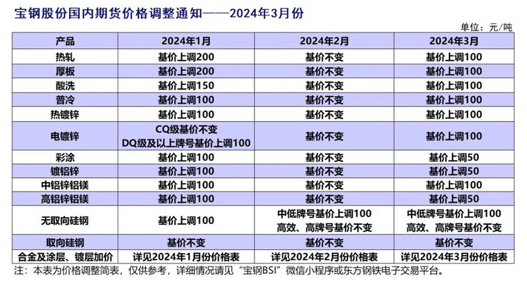 經(jīng)研究決定,寶鋼股份板材內(nèi)銷(xiāo)價(jià)格2024年3月份在2024年2月份基礎(chǔ)上調(diào)整公告如下(以下除特殊注明外,均為不含稅):