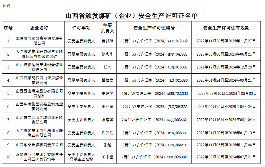 包括這一次,2024年以來(lái),山西省應(yīng)急管理廳已經(jīng)頒發(fā)了7批、累計(jì)105座煤礦(企業(yè))的安全生產(chǎn)許可證: