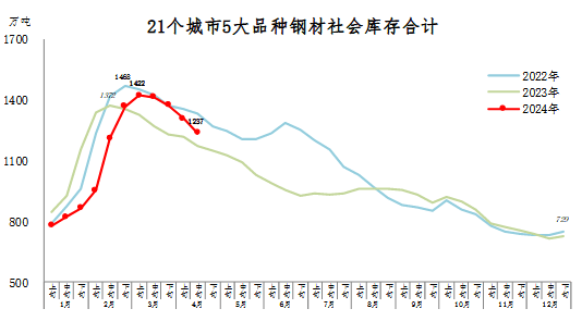 4月中旬,21個(gè)城市5大品種鋼材社會(huì)庫存1237萬噸,環(huán)比減少71萬噸,下降5.4%,庫存連續(xù)下降;比年初增加508萬噸,上升69.7%;比上年同期增加67萬噸,上升5.7%。