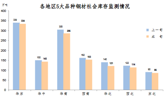 4月中旬,分地區(qū)來看,七大區(qū)域庫存環(huán)比均有不同程度下降,具體情況為:華北庫存環(huán)比減少19萬噸,下降13.6%,為減量和降幅最大地區(qū);華南減少19萬噸,下降6.2%;西南減少9萬噸,下降5.6%;西北減少8萬噸,下降6.6%;華中減少7萬噸,下降4.7%;華東減少5萬噸,下降1.5%;東北減少4萬噸,下降4.4%。