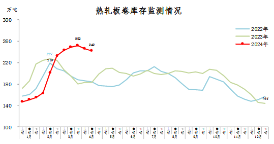 4月中旬,熱軋板卷庫存242萬噸,環(huán)比減少4萬噸,下降1.6%,庫存小幅下降;比年初增加98萬噸,上升68.1%;比上年同期增加59萬噸,上升32.2%。