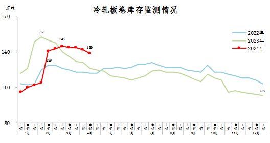 4月中旬,冷軋板卷庫存139萬噸,環(huán)比減少3萬噸,下降2.1%;比年初增加36萬噸,上升35.0%;比上年同期增加13萬噸,上升10.3%。