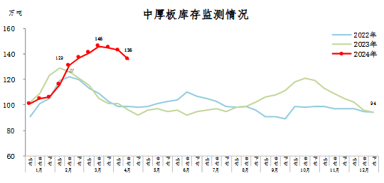 4月中旬,中厚板庫存136萬噸,環(huán)比減少7萬噸,下降4.9%,庫存降幅擴(kuò)大;比年初增加42萬噸,上升44.7%;比上年同期增加40萬噸,上升41.7%。