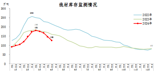 4月中旬,線材庫存126萬噸,環(huán)比減少20萬噸,下降13.7%,庫存連續(xù)大幅下降;比年初增加43萬噸,上升51.8%;比上年同期減少33萬噸,下降20.8%。